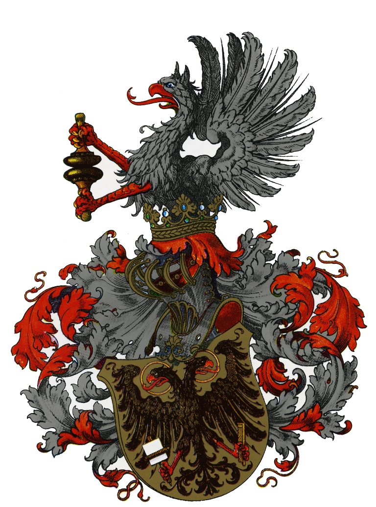 Auf goldenem Feld befindet sich ein Schwarzer Doppel-Adler mit Heiligenschein, rotem Schnabel, Zunge, Beinen und Krallen. In der rechten Klaue hält er einen Manuskripthalter und in der linken einen Winkelhaken.